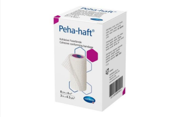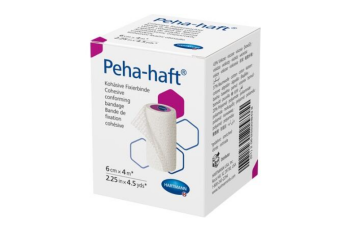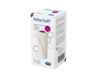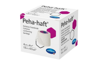 Peha-Haft Cohesive, elastic conforming bandages with a double adhesive effect due to its crêpe texture and micro-structured coating; extensibility about 85 %; low consumption of material due to its strong self-adhesive effect; only a few turns are needed to provide a secure, long-lasting dressing retention; the bandage adheres to itself, but not to skin, hair or clothing; permeable to air and skin-friendly.