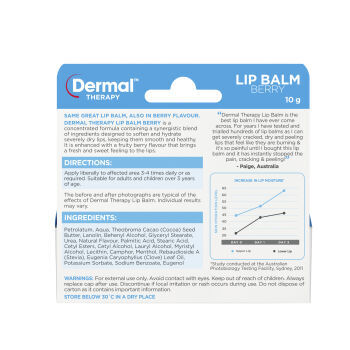 Dermal Therapy Lip Balm Berry is a concentrated formula containing a synergistic blend of ingredients designed to soften and hydrate severely dry lips, keeping them smooth and healthy. It is enhanced with a fruity berry flavour that brings a fresh and sweet feeling to the lips.