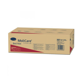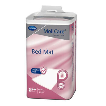 MoliCare Bed Mat 7 drops with cellulose fluff containing absorbent core and waterproof polyethylene backsheet for reliable bed or chair protection. Suitable for use as a direct incontinence bed mat or as additional bed protection when used with or without continence pads. Two sizes.