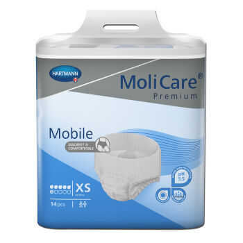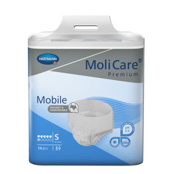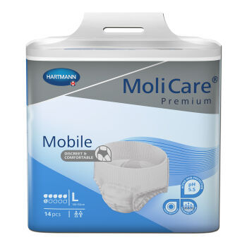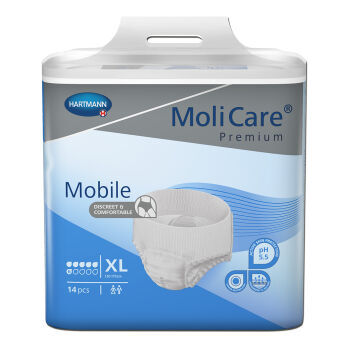 MoliCare Premium Mobile pull up pants look and feel like normal underwear and offer the highest level of leakage protection. Its three way protection system gives MoliCare Mobile extra-strong leakage protection. The unique DryPlus non-woven layer locks liquid away rapidly to keep the skin comfortably dry.
