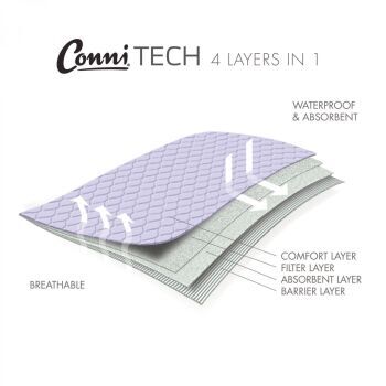 Conni Bed Pad No Tuck In allows you to say goodbye to the days of daily cycles of wet, wash, dry and repeat with your sheets. Conni absorbent and waterproof bed pads assist in the management of incontinence, bedwetting and toilet training. Our Conni Bed Pads are designed to hold 2 litres over an eight hour period, which means they are the perfect addition to any bed that requires full void protection.