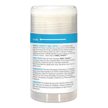 Rub Dermal Therapy Heel Magic morning & night to dry, cracked feet. Once heels and feet are restored, continue use to maintain hydration.