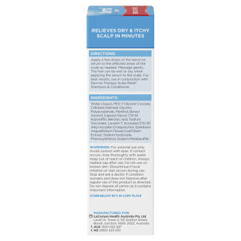 Apply a few drops of the leave-on serum to the affected areas of the scalp as needed. Massage gently. The hair can be wet or dry when applying the serum to the scalp. For best results, use in conjunction with Dermal Therapy Scalp Relief Shampoo & Conditioner.